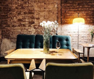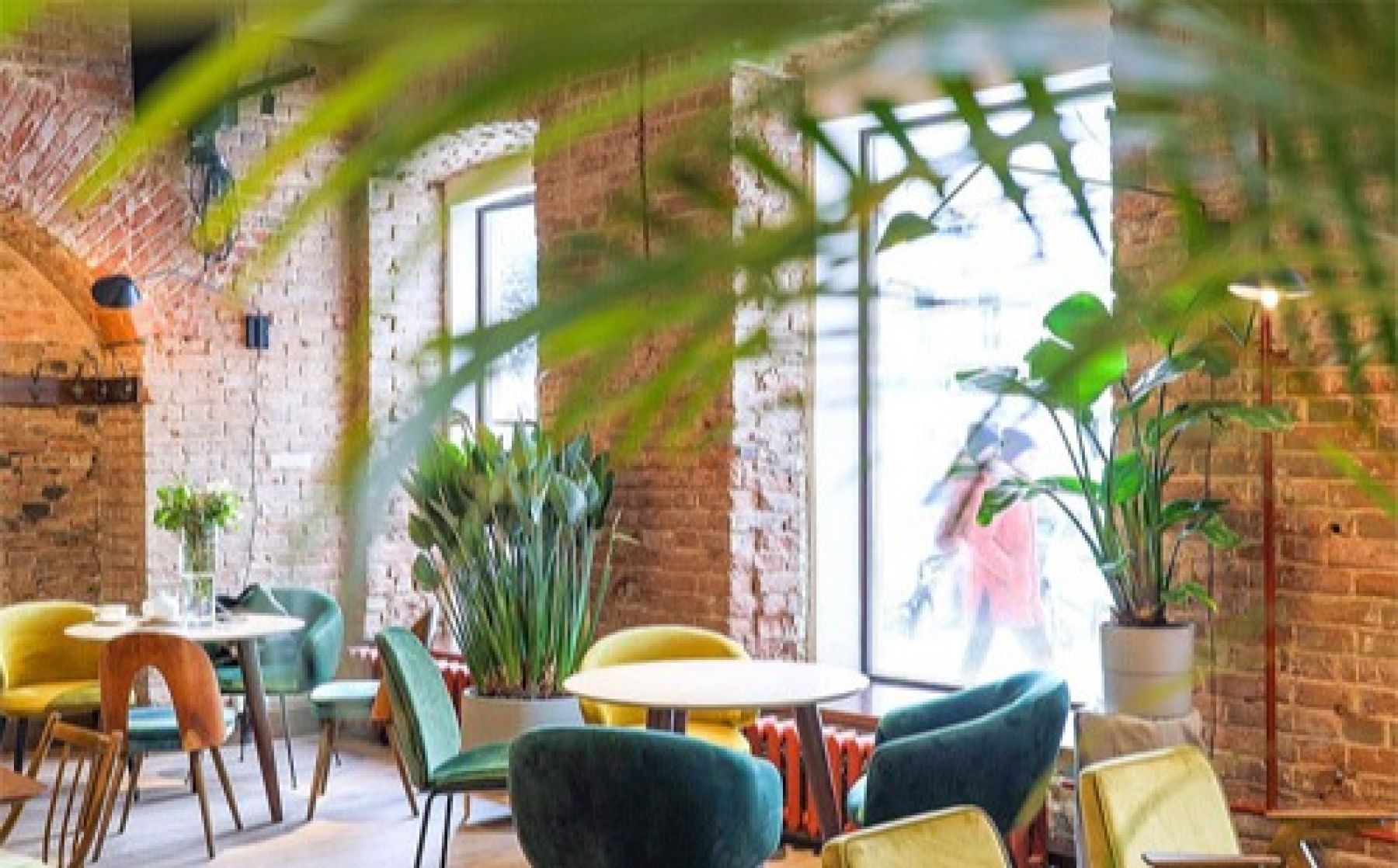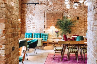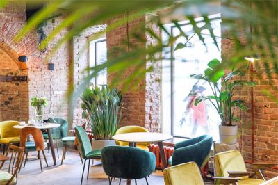 Зал кафе оформлен в стильном лофт-стиле: стены из красного кирпича, яркие акценты бирюзового, жёлтого и бордового цветов, живые растения создают тёплую и уютную атмосферу. Апельсиново-оранжевые батареи добавляют пространству ещё больше уюта и яркости.