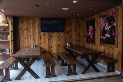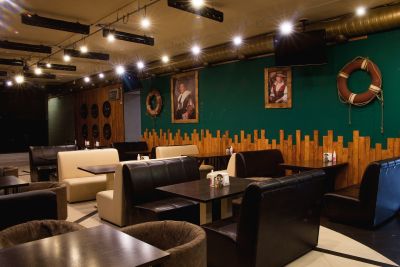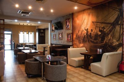 Интерьер, выполненный в стиле пиратской бухты, добавляет атмосфере особый колорит. Меню включает разнообразные блюда европейской кухни: от мясных и рыбных деликатесов до горячих блюд и закусок. Есть возможность приносить свои крепкие напитки.