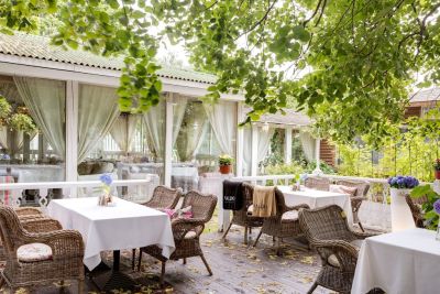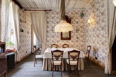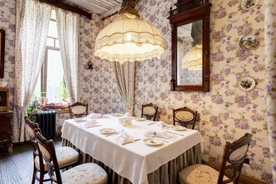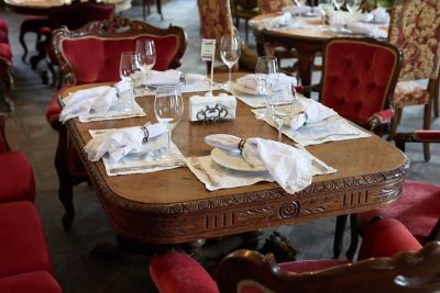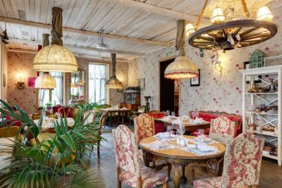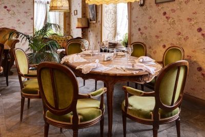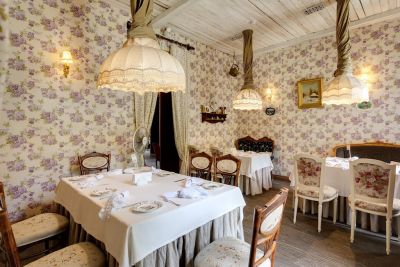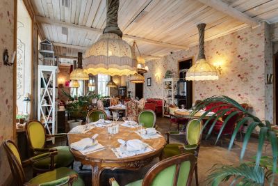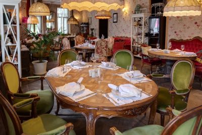 2. Разнообразие залов: в ресторане есть несколько залов, которые отличаются атмосферой и вместимостью. Закрытая галерея вмещает до 150 человек, летняя открытая площадка — до 40 человек, французский зал с антикварной мебелью — до 40 человек, а русский зал — до 15 человек.