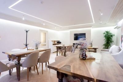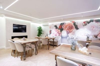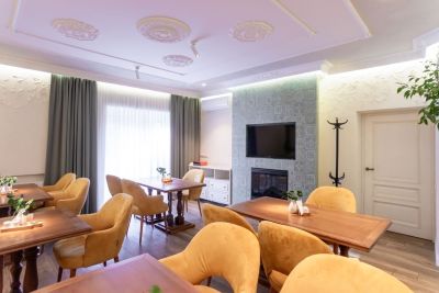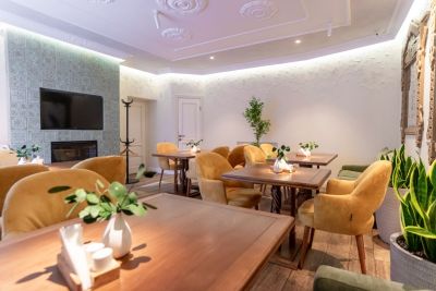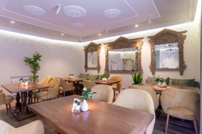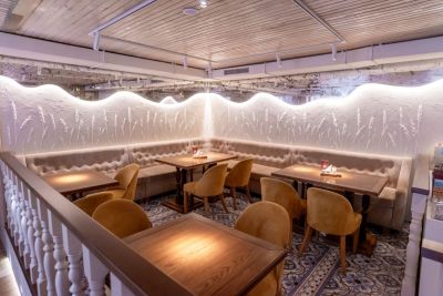 Ресторан с элегантным интерьером, где светлые стены, деревянные панели и карамельно-бежевая плитка на полу создают теплую и уютную атмосферу. Мягкие кресла, широкие диваны и винтажные торшеры добавляют обстановке изысканности.