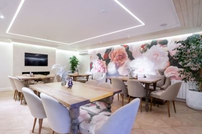 Ресторан располагает несколькими камерными банкетными залами, подходящими для небольших торжеств. Современное оснащение включает музыкальное оборудование, проектор, TV-экраны и Wi-Fi. Возможна организация выездной регистрации.