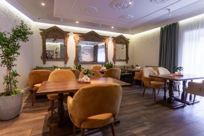 Меню сочетает национальные блюда и европейскую классику, а для маленьких гостей предусмотрено специальное детское меню. Для их удобства оборудована яркая игровая комната.