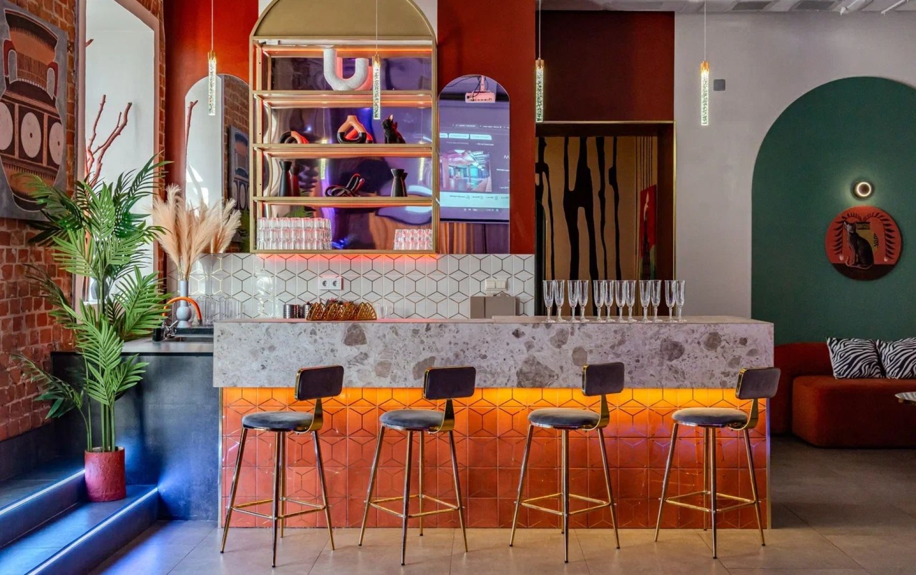 Подойдет для компании до 40 человек. 20 посадочных мест, 40 фуршет. Дизайн зала выполнен в теплых тонах в стиле лофт фьюжн.