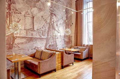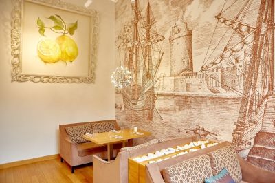 На территории есть своя кухня, где готовят блюда средиземноморской кухни с акцентом на рыбу и морепродукты. Авторская подача и широкий выбор вин не оставят вас равнодушными. А эксклюзивные десерты станут настоящим украшением любого стола.