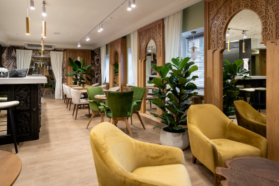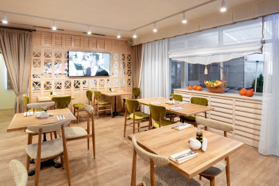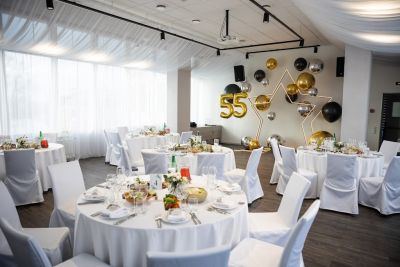 Банкетный зал комплекса способен вместить большое количество гостей. В нём есть всё необходимое для проведения мероприятий: сцена с музыкальным оборудованием, проектором и TV-экранами, велком-зона, где можно встретить гостей, и выделенная парковка на 10 машин.