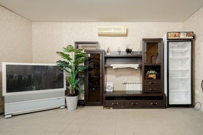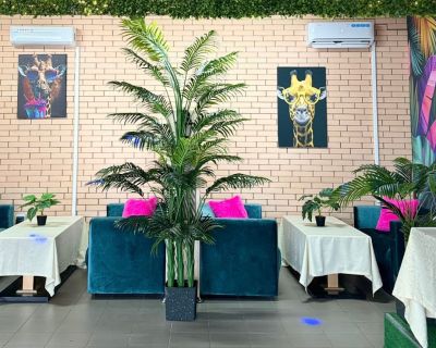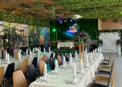 Банкетный зал оформлен в стильном и современном стиле, что создаёт атмосферу роскоши и изысканности. Здесь есть сцена, музыкальное оборудование и велком-зона, где гости могут расслабиться и насладиться атмосферой перед началом мероприятия.