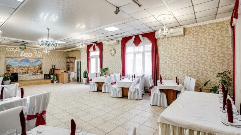 Зал кафе «Лео» оформлен в сдержанном стиле, который сочетается с любым тематическим оформлением. Высокие потолки и большие окна создают ощущение простора и лёгкости. Мягкие диваны и удобные кресла расположены так, чтобы гости могли свободно общаться друг с другом. На стенах висят картины и фотографии, которые добавляют интерьеру изюминку. Светильники и люстры создают уютную атмосферу, а большие экраны на стенах позволяют транслировать видеоматериалы и презентации.