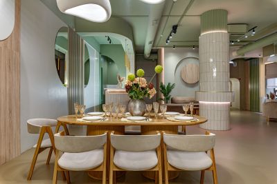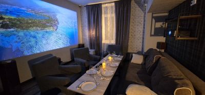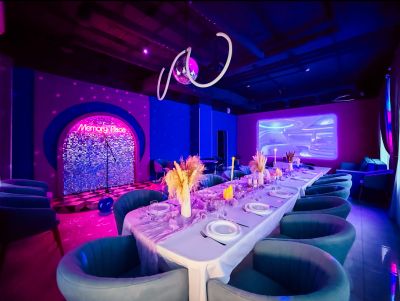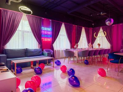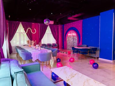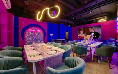 Зал 2 сочетает минималистичный дизайн с утонченной эстетикой, дополненный неоновой подсветкой и монохромным интерьером. Зеленые растения привносят тепло и живую нотку в этот стильный зал.
