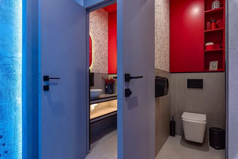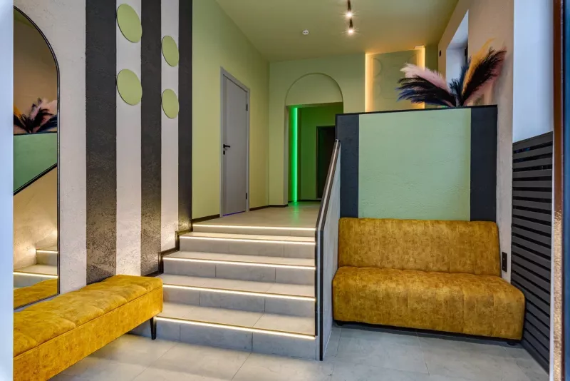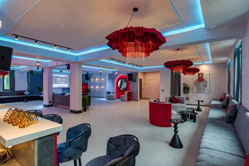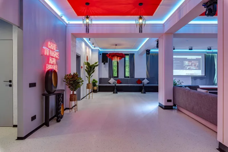 Все что мы хотели вложить в дизайн этого зала: новая жизнь, биение сердца среди серого бетонного минимализма.