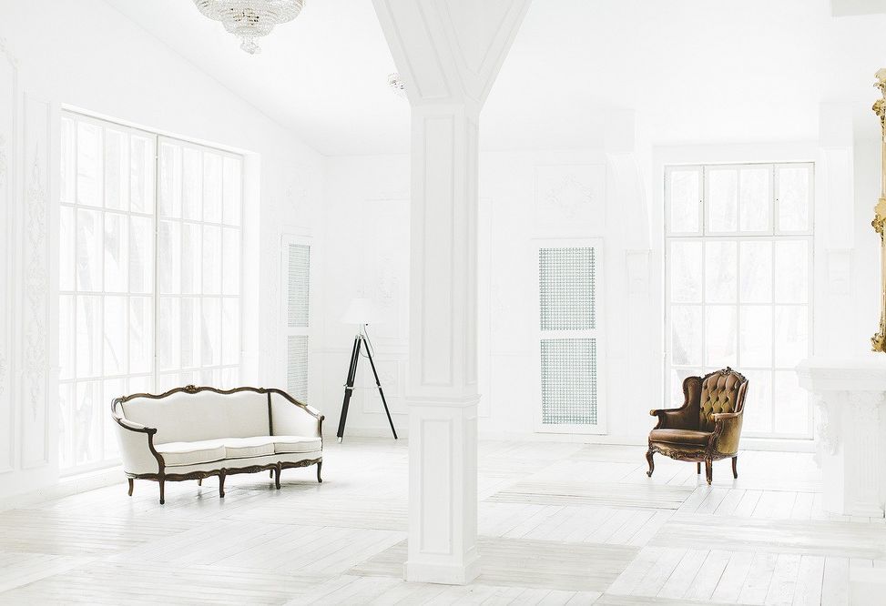 Стильное пространство в классическом стиле, с большими витражными окнами в пол.