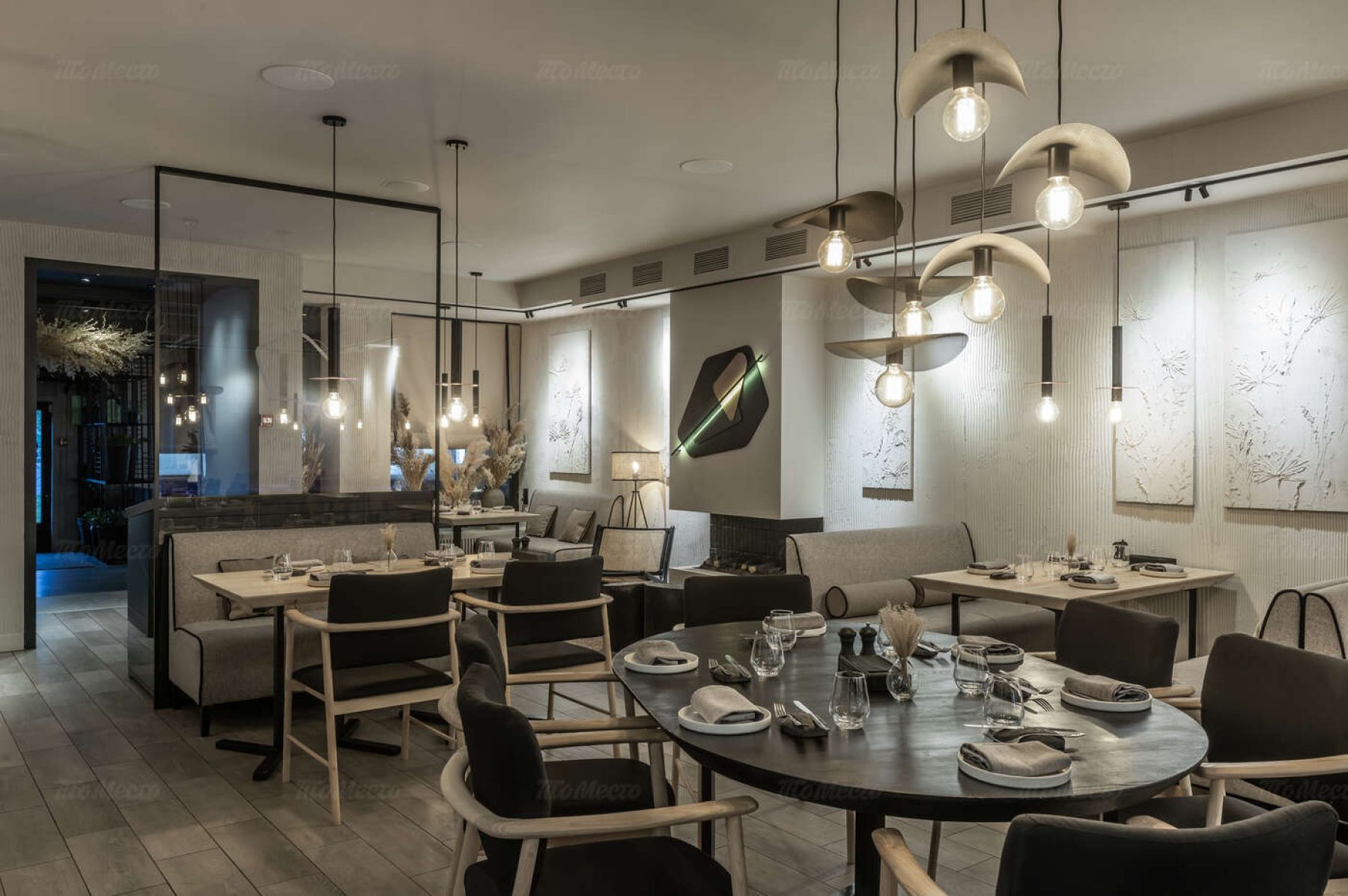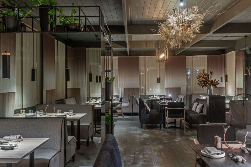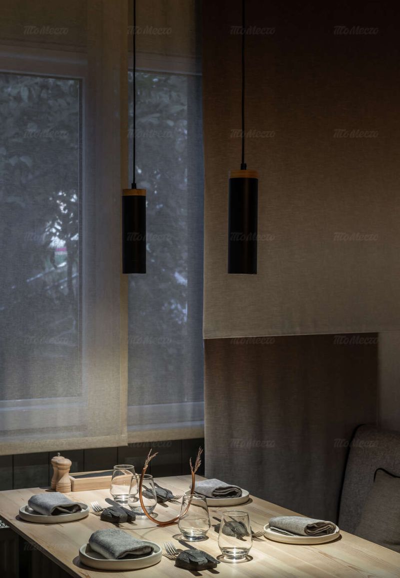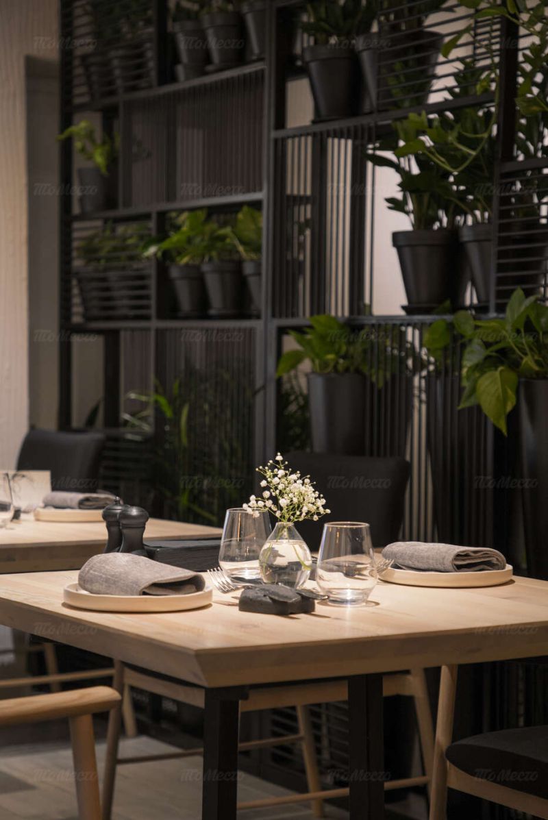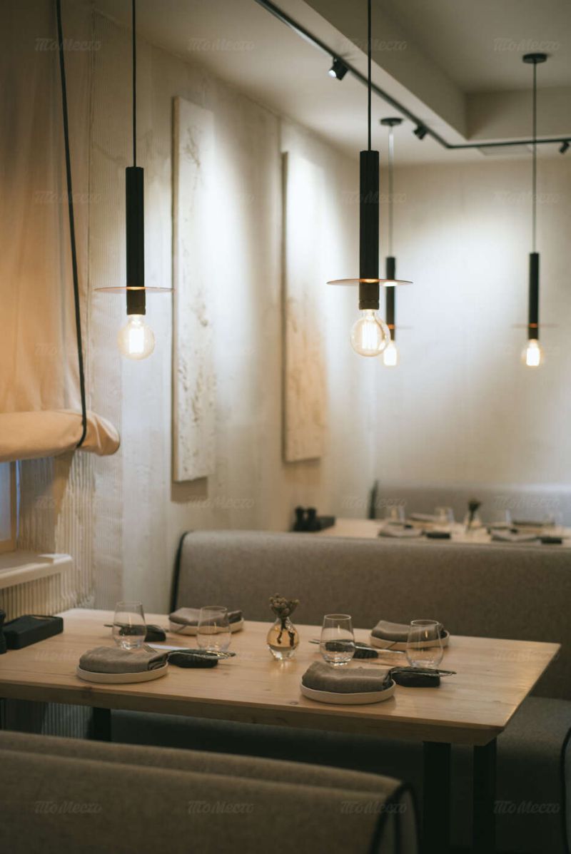 Интерьер ресторана выполнен в спокойных светлых тонах с использованием натуральных материалов. Столы сервированы в классическом европейском стиле и украшены композициями из сухоцветов. Комфортные диваны однотонных расцветок, приятное освещение и комнатные растения создают атмосферу уюта и расслабленности. Здесь приятно пообедать днём и устроить романтический ужин вечером.