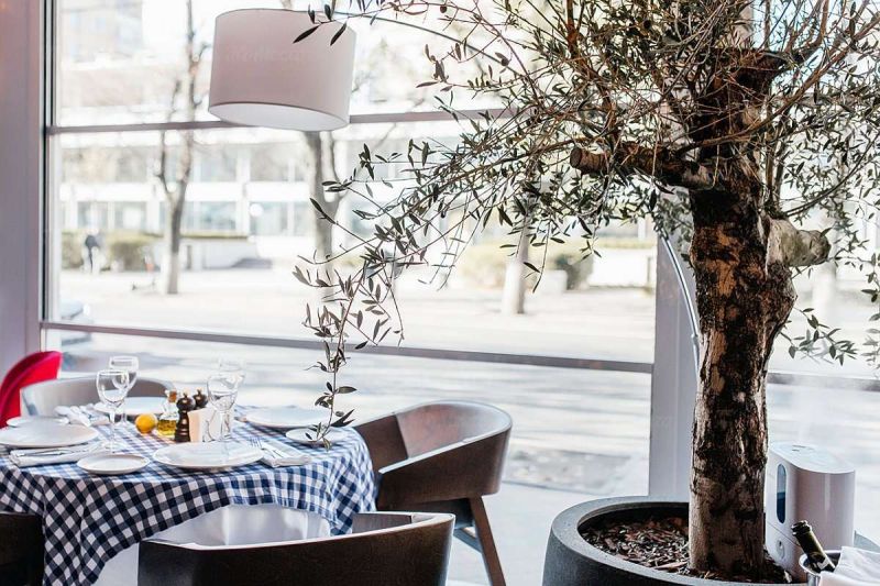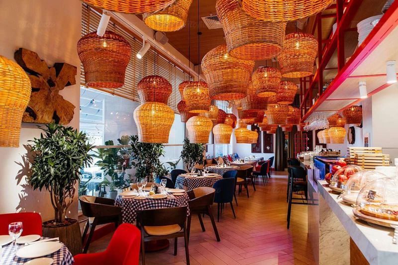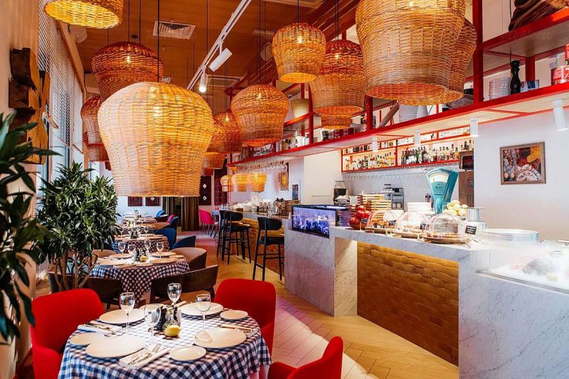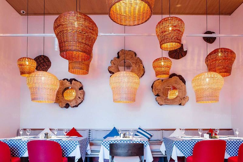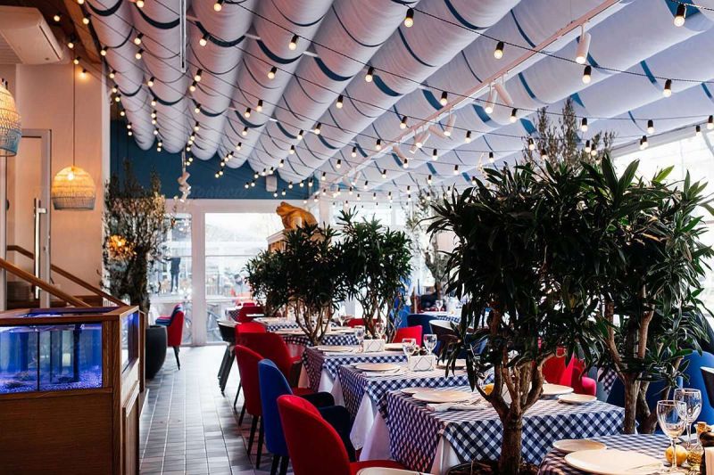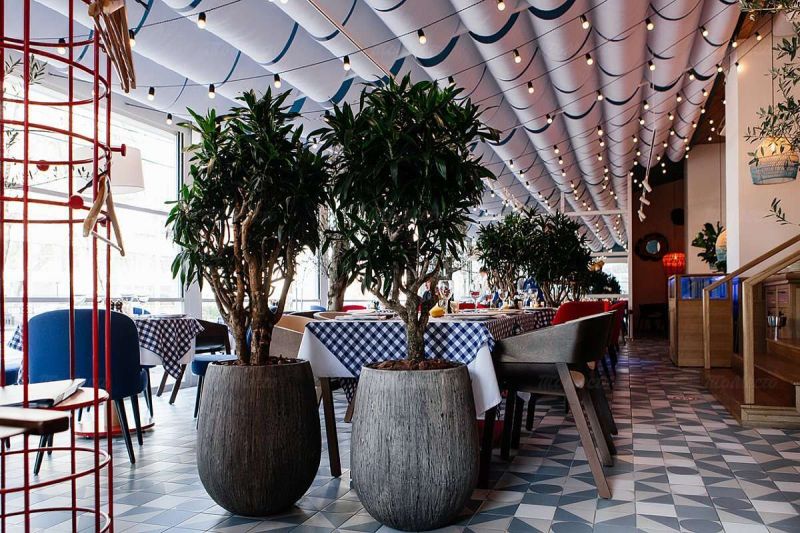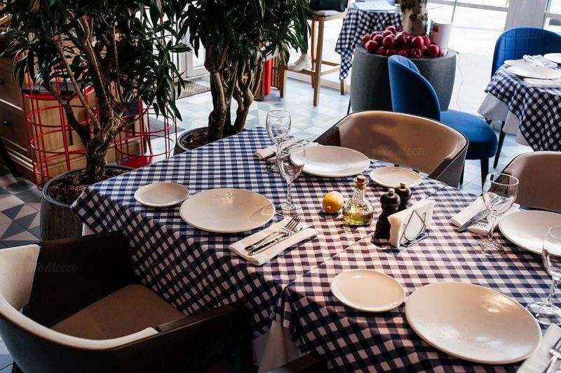 Интерьер ресторана создаёт почти домашнюю атмосферу. Бело-синие клетчатые скатерти, плетёные абажуры и кадки с фикусами делают обстановку комфортной и уютной. В отделке использованы белый, синий и красный цвета, а также светлое дерево и немного нейтрального серого.