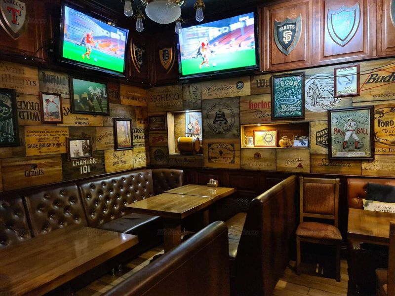 Интерьер большого зала выполнен в стиле американского паба: тёмное дерево, кожаные диванчики и барные стулья, кирпичные стены с флагами футбольных клубов, плакатами и афишами. Длинная стойка может вместить полтора десятка человек.