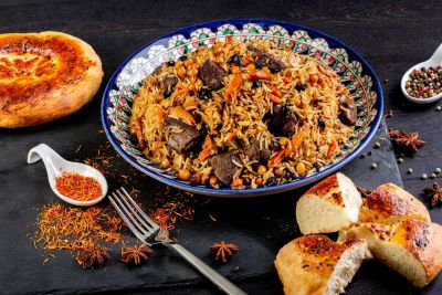 В меню представлены разнообразные блюда узбекской кухни: плов, манты, самса, лагман и другие традиционные угощения.