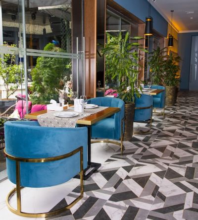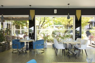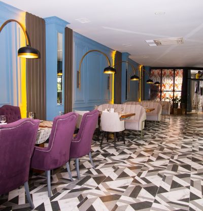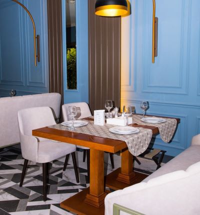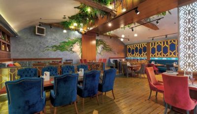 В ресторане есть своя кухня, где готовят блюда европейской, кавказской, грузинской и армянской кухни. Гости могут насладиться изысканными блюдами и напитками, а также привезти свой алкоголь.