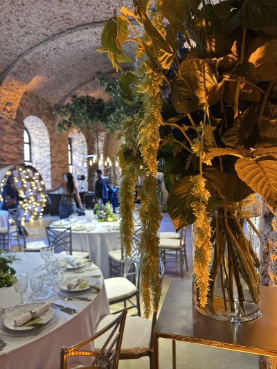 В окружении камня, холода и серости города это пространство — настоящее спасение. Круглый год мы поддерживаем в нем атмосферу жизни, зелени и свежести. Огромное 5 метровое вечнозеленое дерево. в арках расположились разные текстуры, камень, мох, пампасная трава, деревянные текстуры.