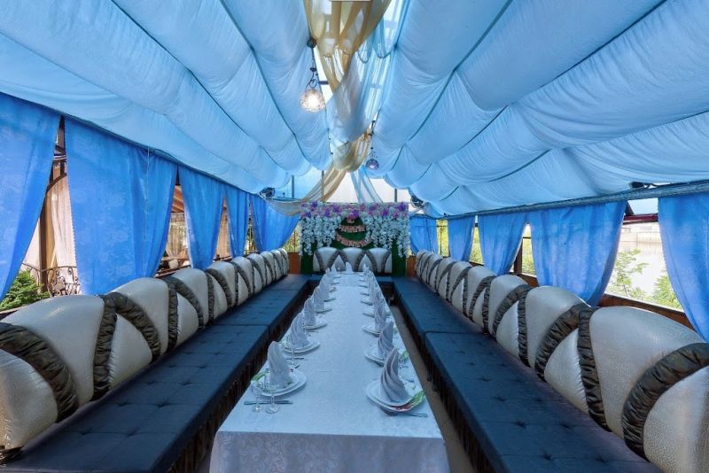 В ресторане есть всё необходимое для проведения банкетов и праздников. Просторный банкетный зал и летние беседки, вмещающие до 40 человек, станут идеальным местом для торжества.