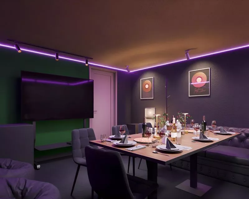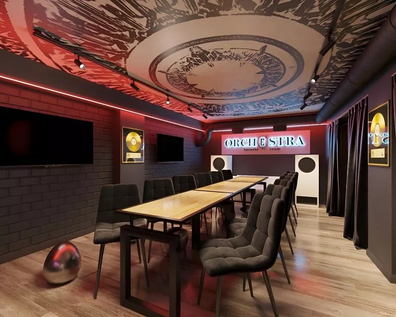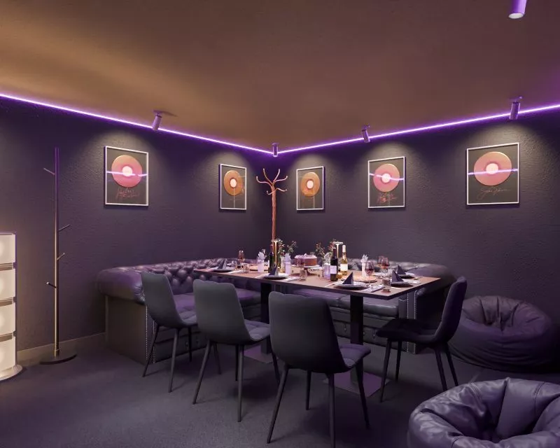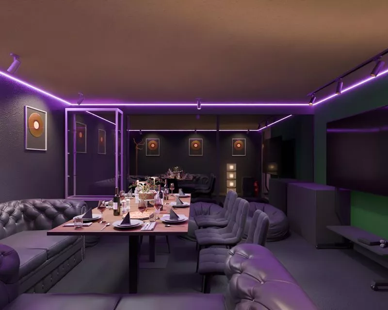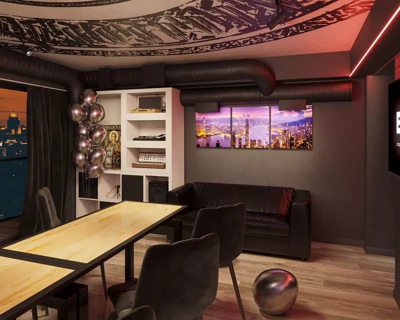 Наш лофт — это уникальное пространство, сочетающее стиль и комфорт. Идеально для музыкальных бэндов, творческих мастер-классов или деловых встреч. Современные элементы декора, неоновое освещение, уютные зоны для общения и отдыха, стильные винтажные детали создают атмосферу уединения. В лофте комфортно разместятся компании до 26 человек.