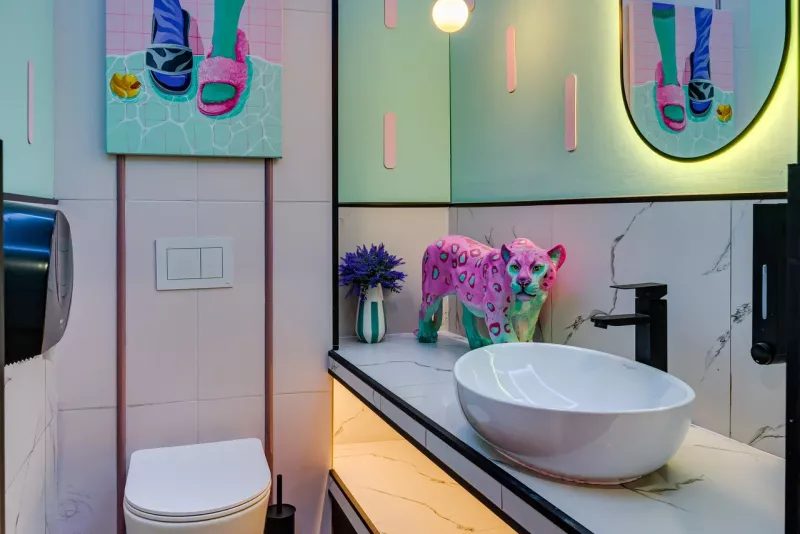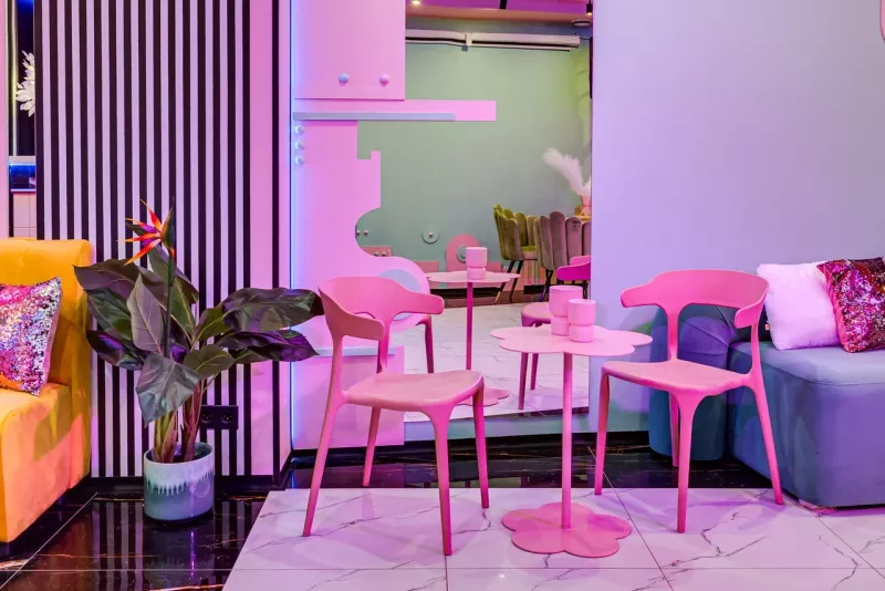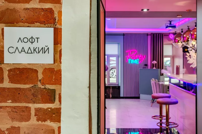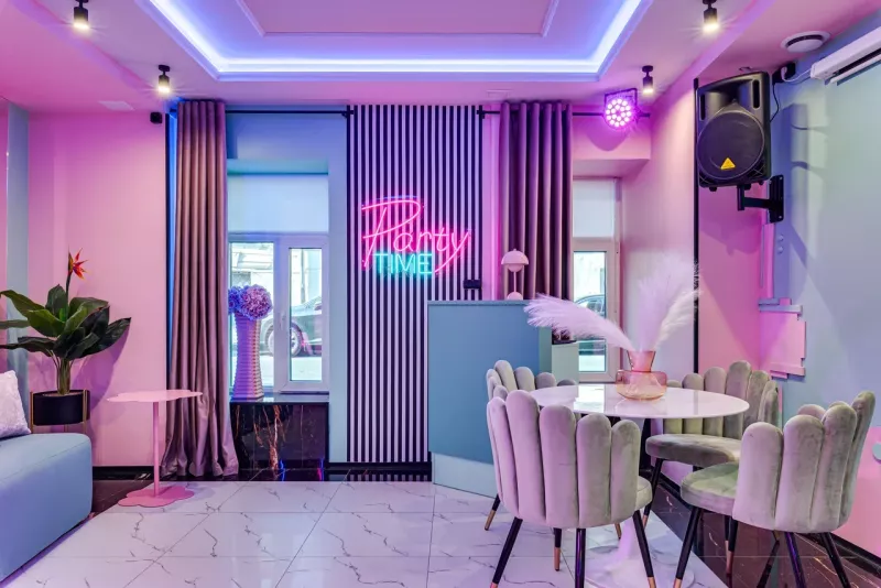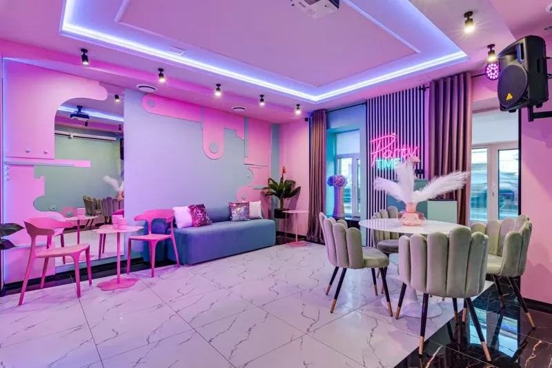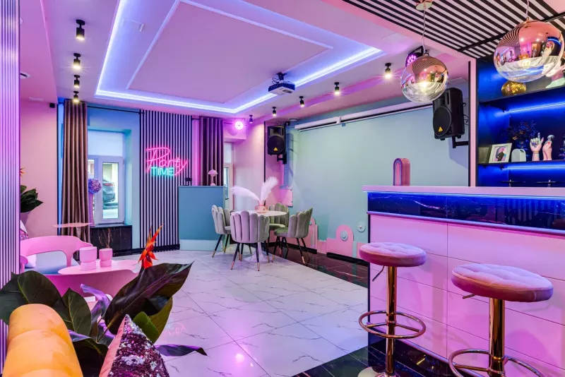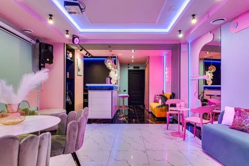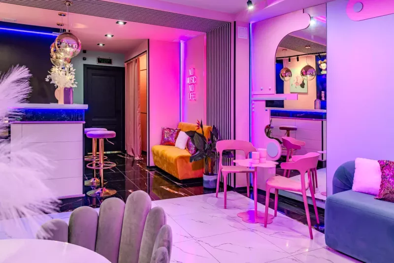 Зал, как конфетка, от которой поднимается настроение и не портятся зубы. Современный глэм-интерьер с элементами поп-арта не оставит вас равнодушным.