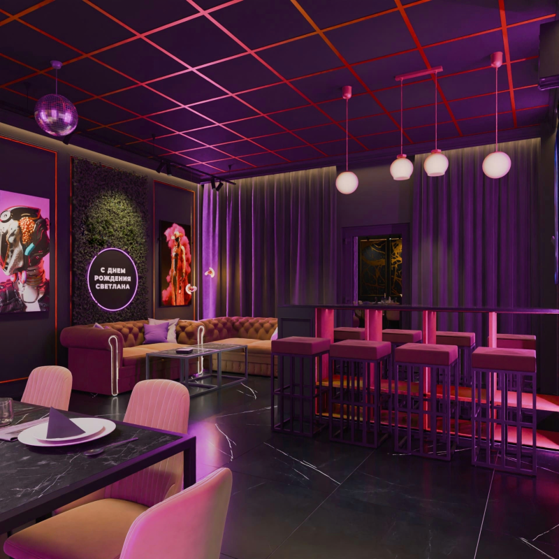 Большой лофт для вечеринок — это современное пространство с яркими акцентами и необычным освещением. Удобный диван и стол создают комфорт для общения, а арт-объекты с футуристичными персонажами добавляют стиля. Этот лофт идеально подходит для организации креативных мероприятий, вечеринок или торжеств. Пространство создаёт атмосферу праздника и эксклюзивности, идеально подходя для ярких событий и запоминающихся вечеров до 54 человек.