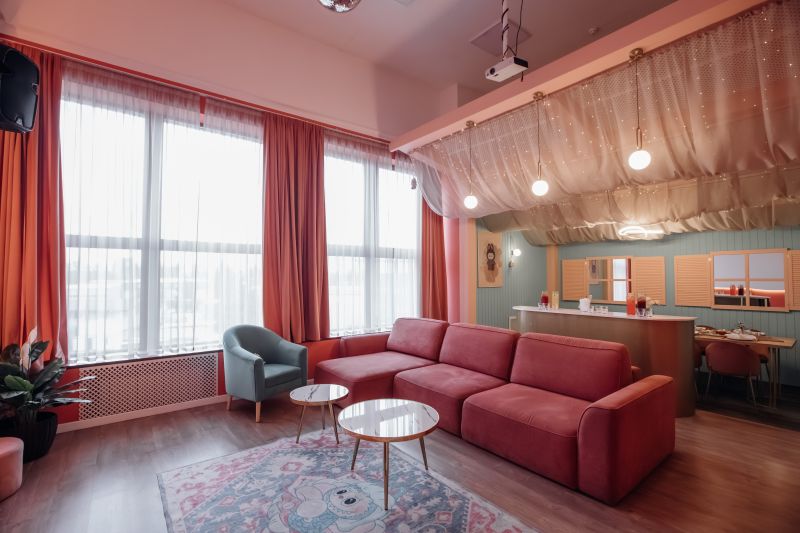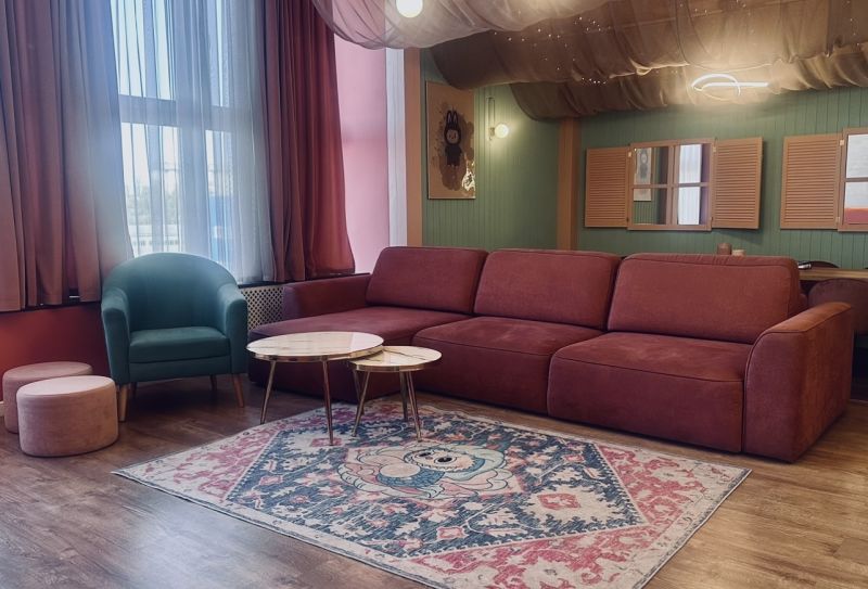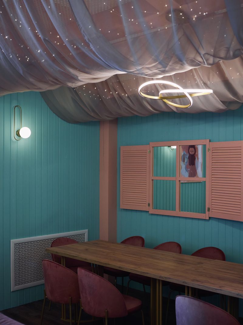 Ламповый зал в нежно-розовых и лазурных оттенках с трендовыми элементами нашумевшей куклы лабубу. Одно из самых необычных пространств в нашей коллекции