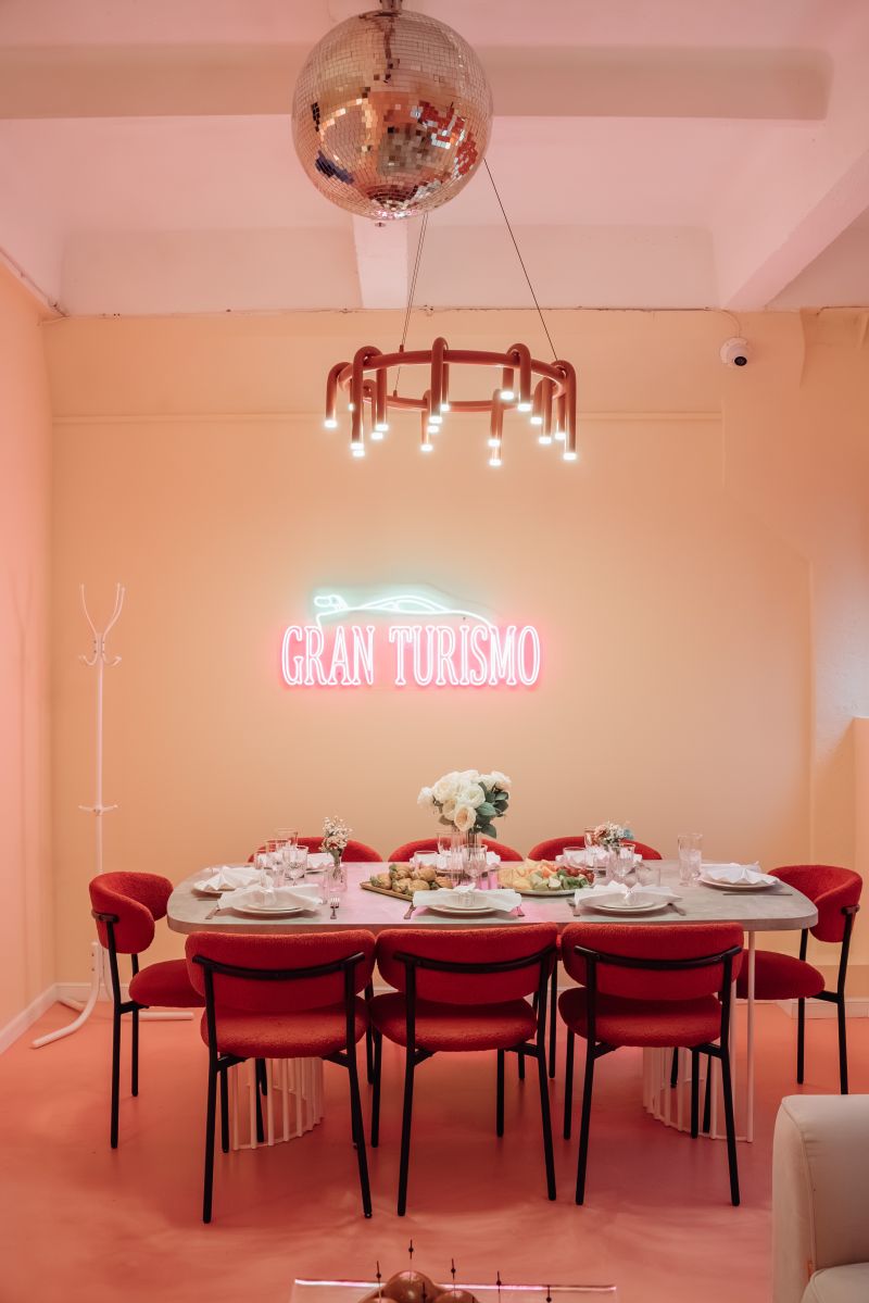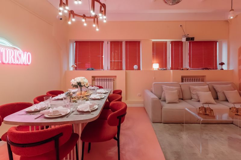 Пространство, где неоновый глянец и мягкие пастельные оттенки создают идеальные декорации для стильных вечеринок. Округлые формы, винтажные постеры и атмосферный свет придают ему богемное, но уютное настроение.