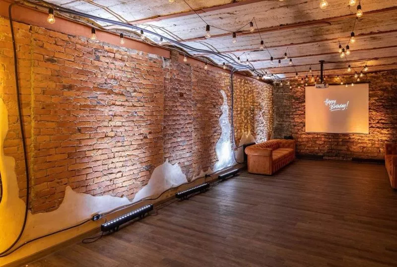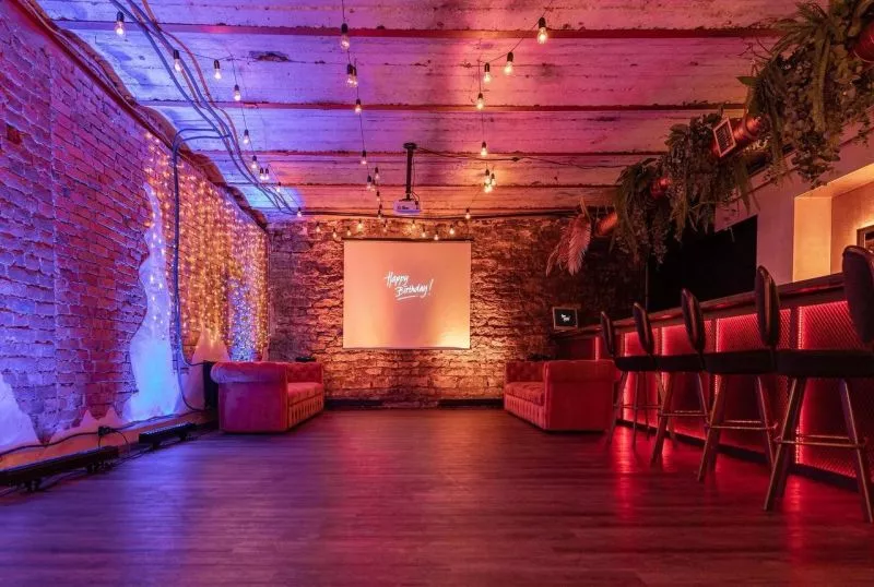 Зал Нью-йорк: воплощение индустриальной романтики мегаполиса. Грубые кирпичные стены, гирлянды лампочек и длинная барная стойка с эффектной красной подсветкой создают атмосферу стильного городского вечера. Неоновое розово-фиолетовое свечение, акценты живой зелени и ажурные светильники добавляют уюта и особого шарма этому урбанистическому пространству.