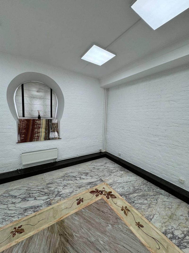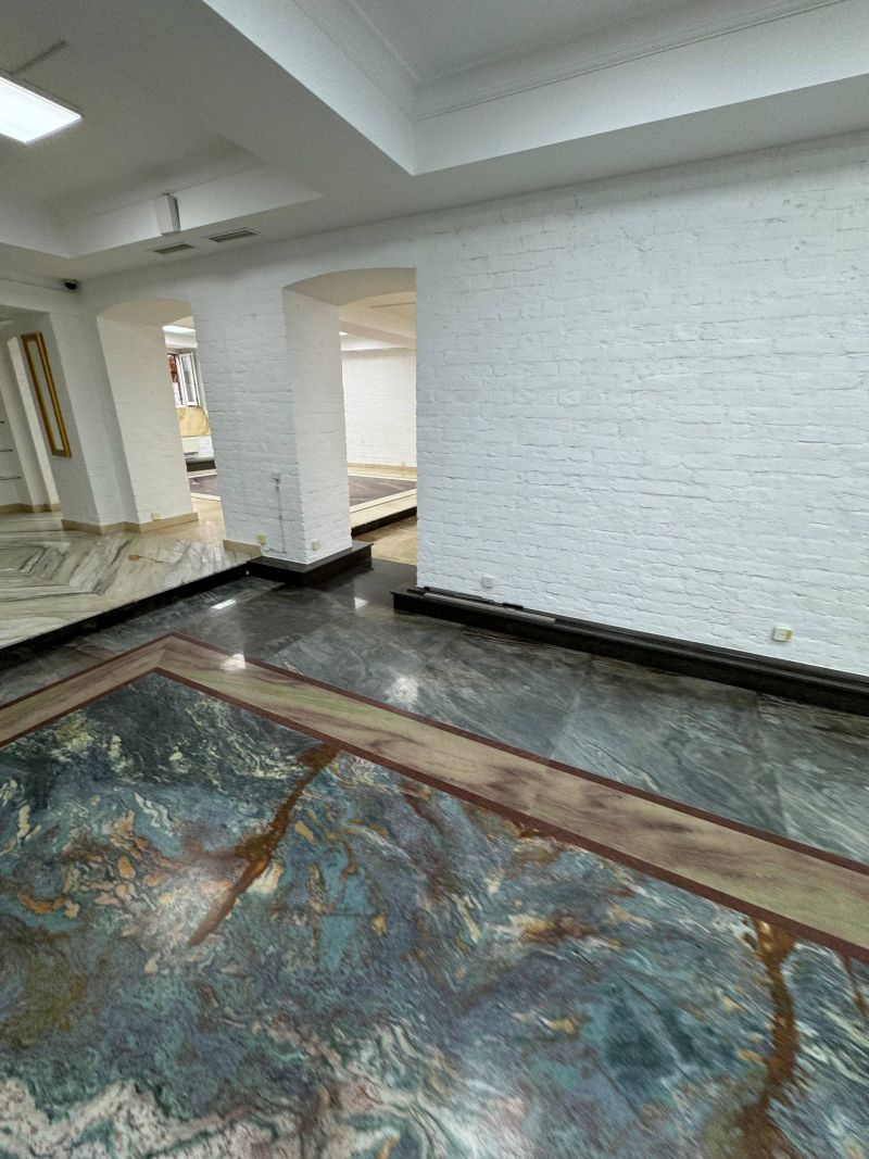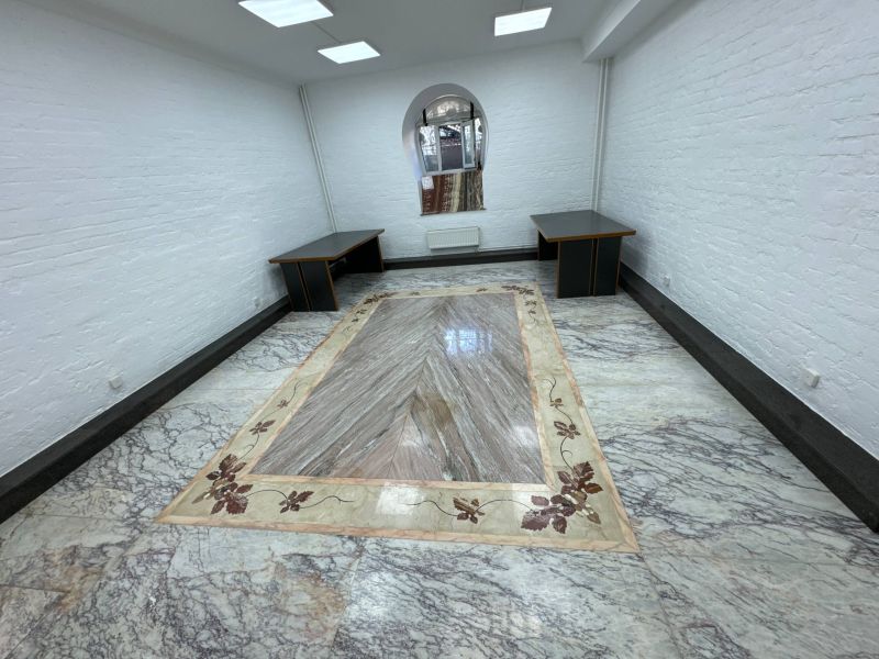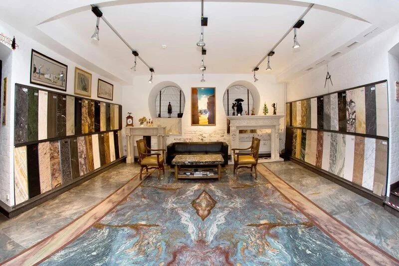 Бывший шоурум премиального мрамора сохранил свою «галерейную» чистоту: безупречные каменные полы с узорами, крупноформатные мраморные плоскости, строгие белые стены и дневной свет с двух сторон.