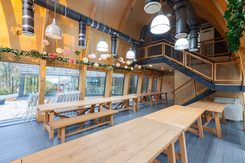 Пространство включает панорамные лофты, светлые залы, оранжереи и веранды — от камерных встреч и фотосессий до масштабных корпоративов и фестивалей. Каждая площадка оформлена в природном стиле и оснащена всем необходимым для мероприятий любого формата — от масштабных праздников до бизнес-встреч.