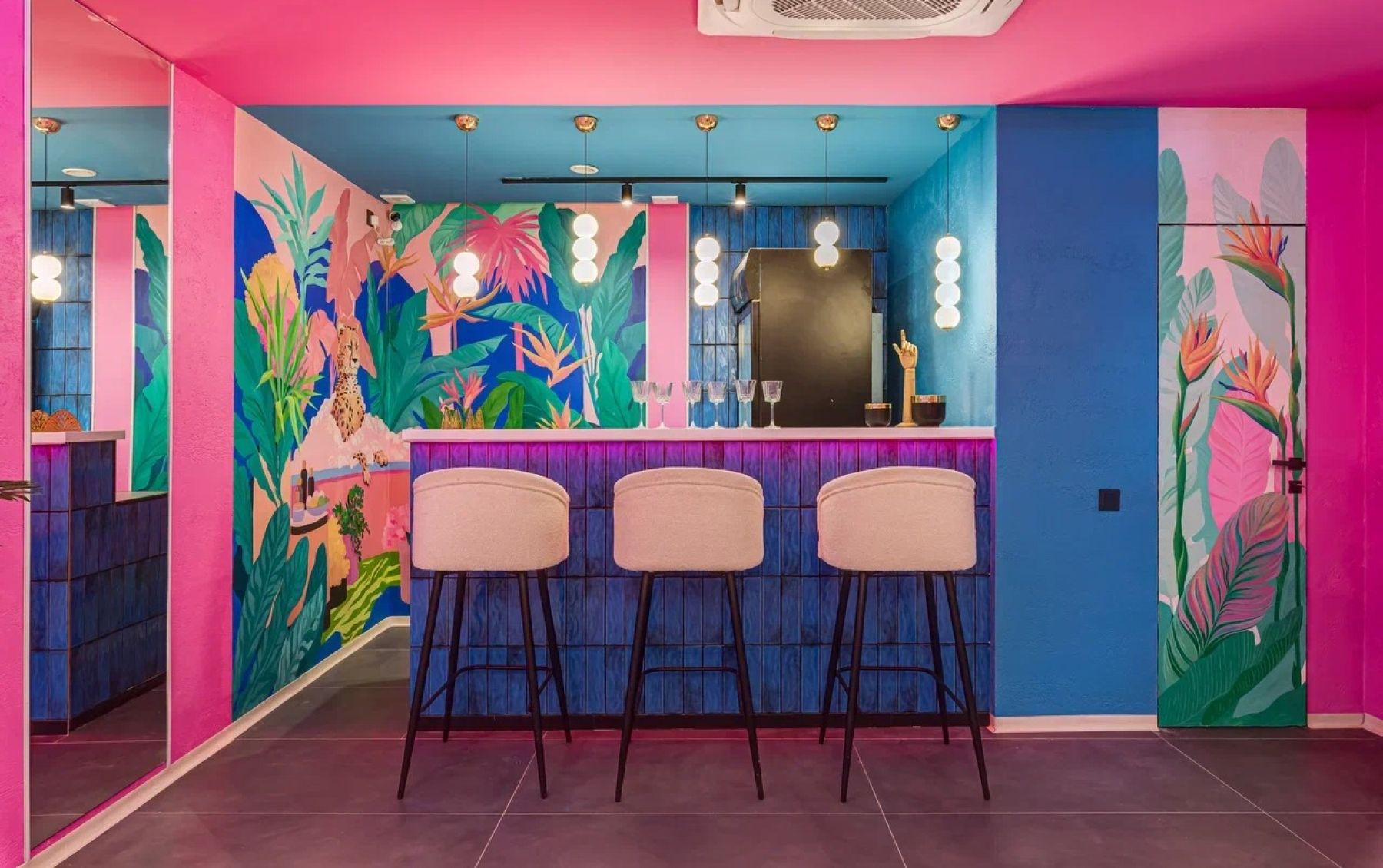Эффектный event-лофт, созданный для тех, кто ценит эстетику, эмоции и атмосферу. Пространство оформлено в смелой сочетании ярко-розового, глубокого бирюзового, пастельного бежа и растительных мотивов. Интерьер напоминает кадры из стильного клипа или арт-фотосессии — здесь каждый уголок работает как фотозона.