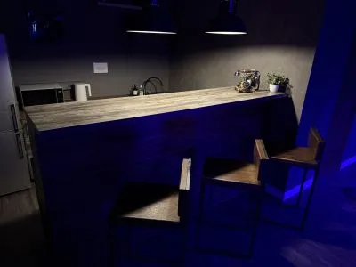 В одной из зон установлен стильный бар, который подчёркивает атмосферу лофта и создаёт удобное место для встреч с друзьями.