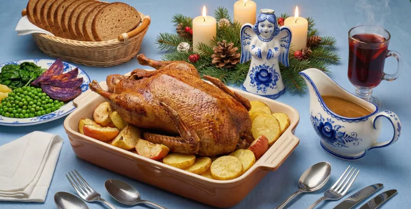 Рождество — это традиционный семейный праздник, к которому принято готовиться заранее, и отмечать за большим обильно накрытым столом. Считается, что надо приготовить библейское число различных блюд — 12, по числу апостолов, чтобы в семье был достаток и мир. Но мы с вами поговорим об одном блюде — о запеченном гусе с яблоками. Обычно он становился центром, и вокруг него уже собирался весь рождественский стол.
