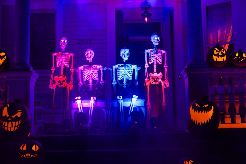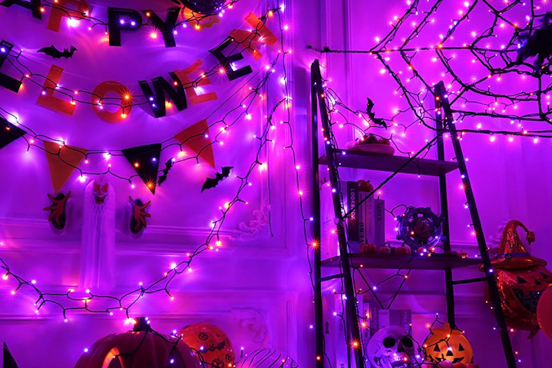 - Свет: Используйте динамические приборы (moving heads), стробоскопы, ультрафиолетовые лампы (для эффекта свечения белого). С помощью гобо-трафаретов можно проецировать на стены силуэты паутины, летучих мышей или призраков.