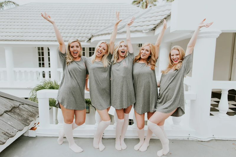 Можно взять за идею фотосессии какой-нибудь фильм. Например, «Побег из Шоушенка». Наденьте джинсовые комбинезоны, найдите фон с бетонными стенами и забудьте про укладку. В кадре играйте в суровую банду: изучайте план побега из города или делайте хмурые фото для полицейской картотеки. Невесте в этом сценарии достается роль главного авторитета, а подругам — верных подельниц. В финале устройте контраст: смените робы на платья и отметьте выход на свободу.