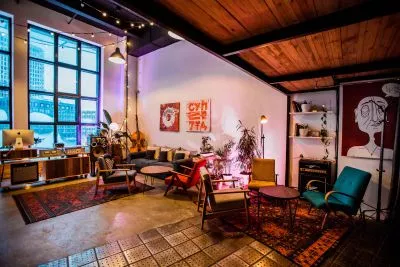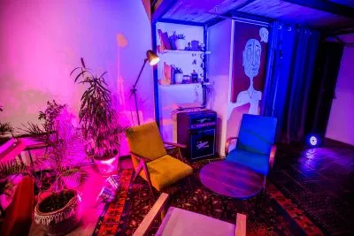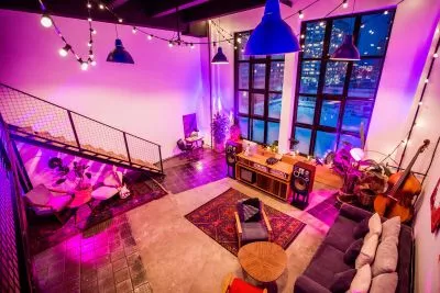Здесь есть небольшая сцена и барная стойка, танцпол и дискошар, коктейли и кальяны, мягкие диваны и приглушенное освещение, которое можно заменить неоновой подсветкой. В лофт разрешат пригласить до 60 человек. Вспоминать о времени не понадобиться: площадка расположена в отдельно стоящем здании, поэтому шуметь и веселиться здесь можно 24/7.