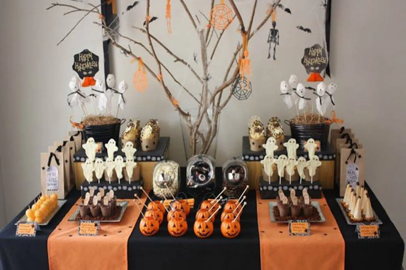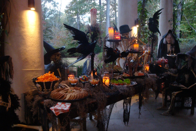 - Декор. Искусственная паутина, черепа, скелеты, тыквы — это классика. Добавьте оригинальности: старинные книги, аптекарские склянки с «зельем», карты таро, зеркала, затянутые тканью. Драпировка стен темной тканью мгновенно преобразит любое помещение.