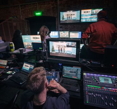 Съемка ведется с нескольких ракурсов и изображение с камер «режиссируется» в прямом эфире — зрители видят динамичное качественное изображение. Для того, чтобы снизить риск технических неполадок до минимума, используется лучшее оборудование и дублирующие системы. Сценарии расположения экранов могут быть разными — от классического, когда два экрана стоят спереди и сзади говорящего, до варианта, когда позади спикера хромакей, а все экраны расположены спереди — в таком случае можно сделать для выступления какой-либо фон.