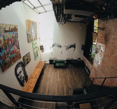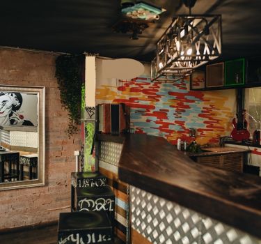 Эта арт-площадка отлично подойдет для граффити-вечеринки на праздник 25 января. Стены лофта украшены авторскими рисунками, здесь есть светомузыка, проектор и барбекю. В любой момент вы можете отдохнуть в барной зоне или подышать свежим воздухом на террасе.