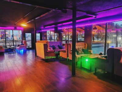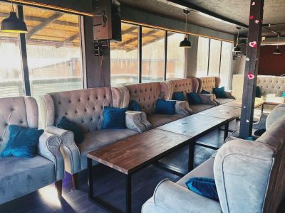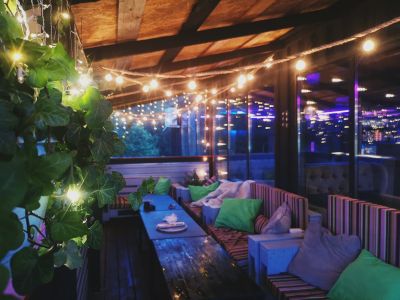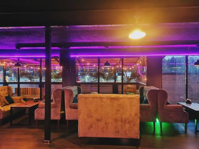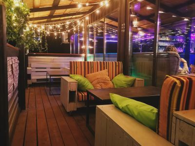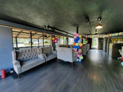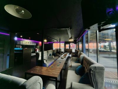 Также на площадке есть барная стойка, танцпол и светомузыка — при желании вечеринка получится «горячей» и по-настоящему праздничной.