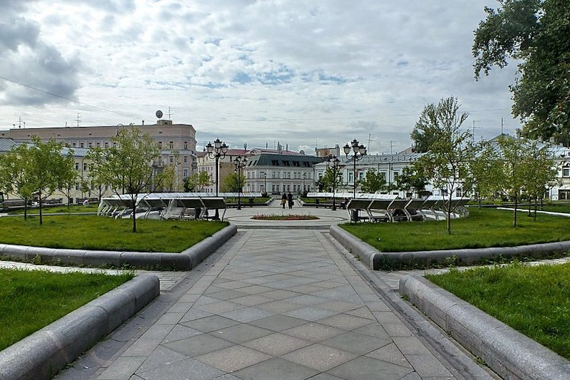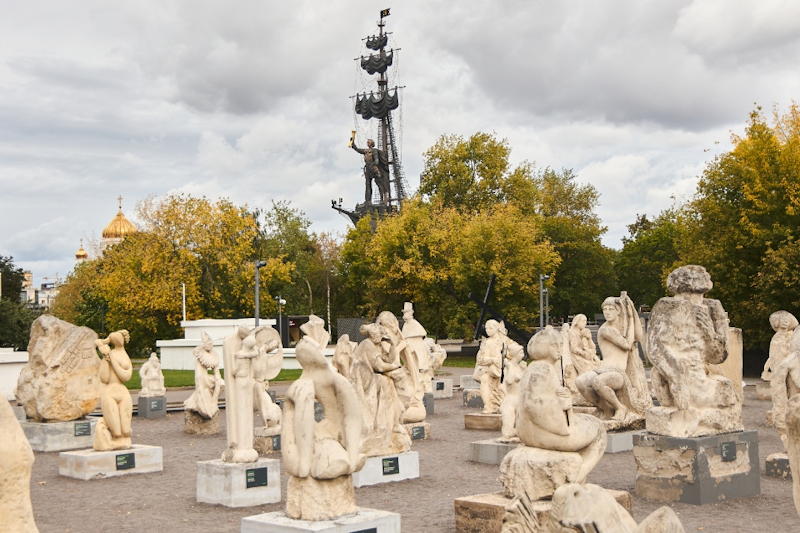Уникальное пространство, где современное искусство, ландшафтный дизайн и советские скульптуры создают необычные визуальные сочетания. Деревянные настилы Крымской набережной, сухой фонтан и вид на памятник Петру I предлагают множество ракурсов.
