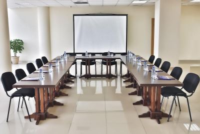 Главное преимущество зала — гибкая планировка. Мебель легко трансформируется под задачи мероприятия: можно организовать театральную рассадку для лекции, посадочные места по кругу для брифинга или расставить столы для стратегических обсуждений.