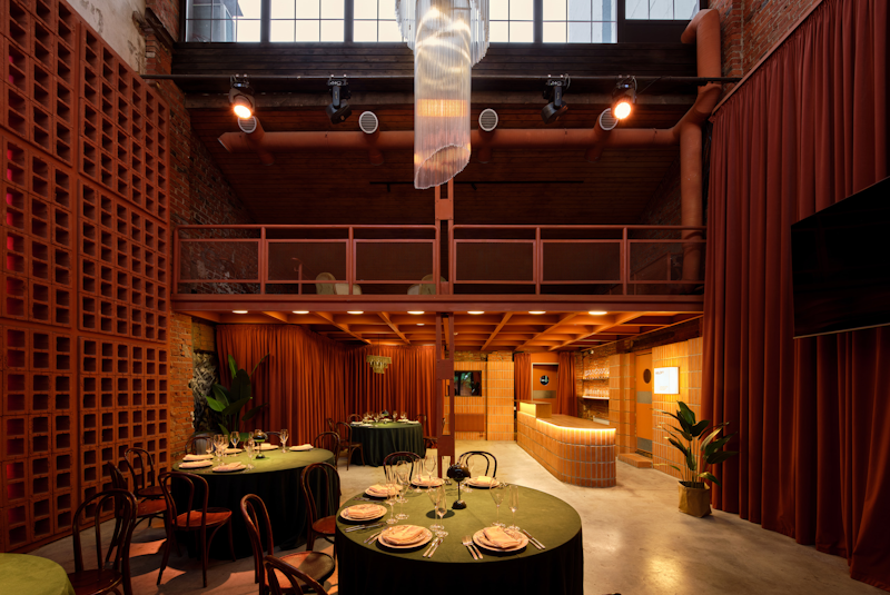 "Этот двухуровневый лофт — настоящий винтажный оазис в мегаполисе. Дизайн сочетает в себе аутентичную индустриальную эстетику с высокими потолками, деревянными элементами декора и кирпичной кладкой стен. Огромные панорамные окна заливают зал мягким дневным светом. Вечером лофт заполняет тёплый уютный свет, исходящий из многочисленных светильников, создавая по-настоящему «ламповую» атмосферу. Особенность интерьера — роскошная многоступенчатая раритетная люстра, ставшая центральным арт-объектом. Это место идеально для встречи Нового года в стильной и душевной обстановке.