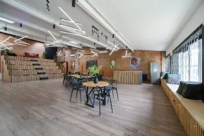 Просторный лофт с большой террасой — одно из лучших мест для большого количества гостей. Здесь можно организовать фуршет, пригласить кейтеринг, принести любую еду и напитки. Важный плюс — отдельная игровая комната для детей. Для съемки молодоженов можно выбрать зоны на полуоткрытой веранде или в основном зале. Здесь есть гамаки, подвесные качели, яркие и удобные диваны, деревянная барная стойка.