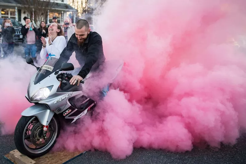 - Мотоциклист с факелом — байкер врывается на праздник с цветным дымом.