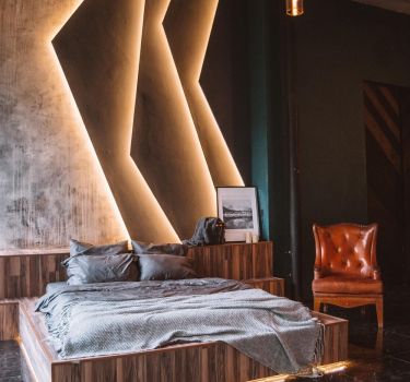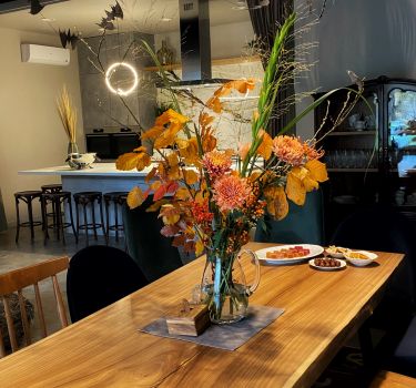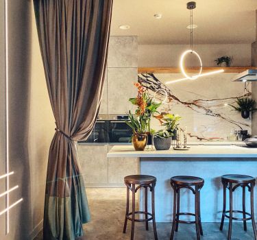 Здесь вы почувствуете себя так же тепло и уютно, как дома. В одном пространстве расположено сразу несколько фотозон, поэтому на память вам останется много красивых и разнообразных снимков. Можно сделать несколько кадров с кружкой ароматного кофе у панорамного окна на кухне. Присесть на небольшой бархатистый диванчик персикового цвета или удобно устроиться на большой кровати среди подушек. А еще не забудьте подняться на второй этаж — в зону с книжным стеллажом.
