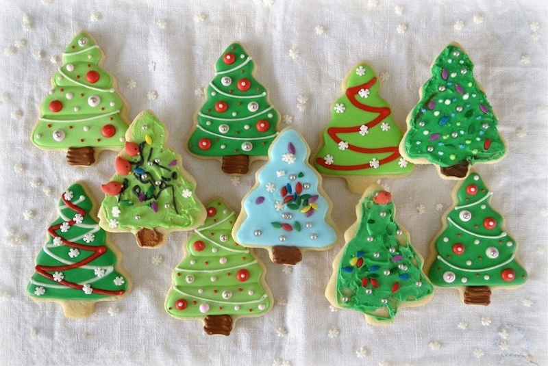 Что понадобится: простое тесто для лепки (мука, соль, вода), формочки в виде ёлочек, натуральные красители (их можно купить в любом магазине для кондитеров), палочки корицы, звездочки бадьяна, семена кардамона, цветная посыпка, блестки, ленточки, духовка для запекания заготовок.