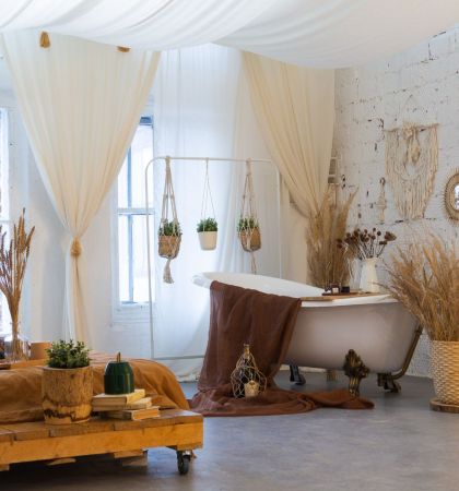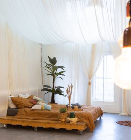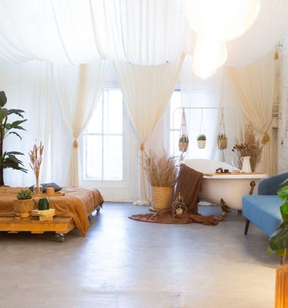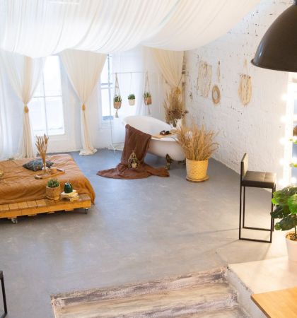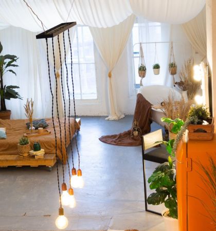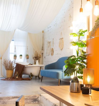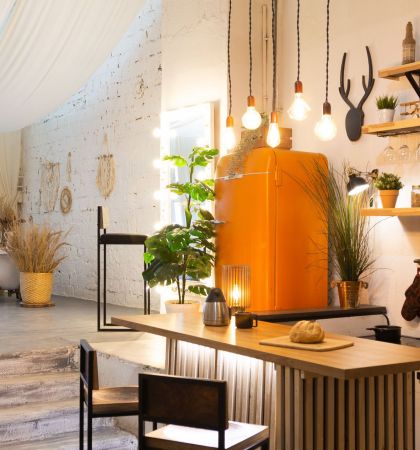 Этот двухуровневый лофт — настоящий мастер перевоплощений. Днем пространство наполнено солнечным светом, а вечером в нем загораются десятки гирлянд, заполняя помещение сказочным приглушенным светом. В такой атмосфере хочется собраться в кругу друзей и слушать захватывающие истории. Конечно, после того, как все гости вдоволь навеселятся и будут готовы немного отдохнуть.