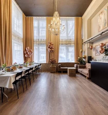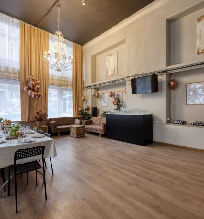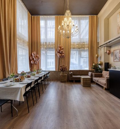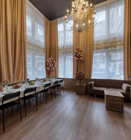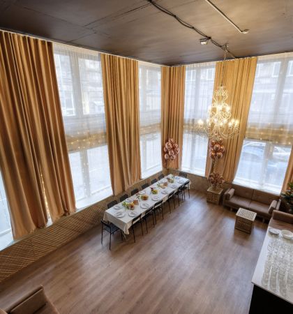 Просторный лофт с большими окнами, расположенный неподалеку от станции метро «Воробьевы горы», прекрасно впишется в концепцию пижамной вечеринки. Уют празднующим обеспечен: ведь здесь есть мягкие кресла и диваны, а также пледы и много-много подушек. Оформлено пространство в теплой бежевой цветовой гамме. Здесь можно организовать праздник для 30 гостей.