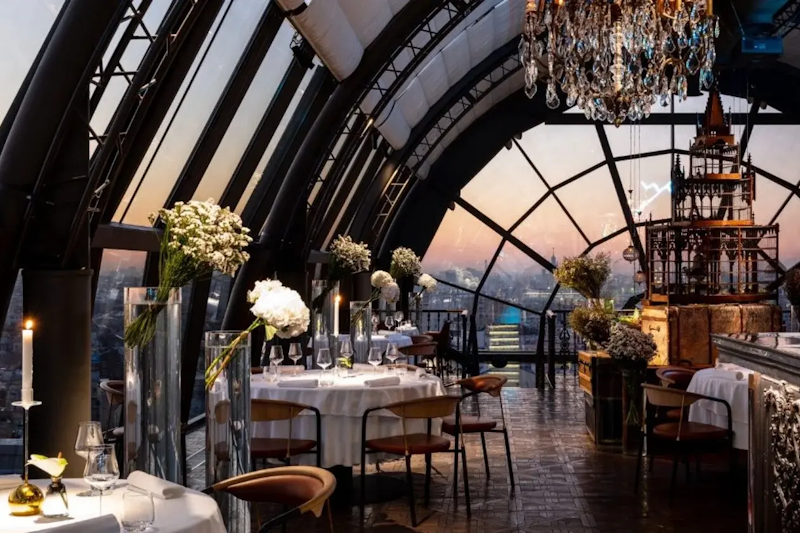 - Особенности: Авторская кухня шеф-повара Владимира Мухина, основанная на русских продуктах и мировых техниках. Два зала — основной под куполом и закрытая VIP-зона. Возможна полная аренда для банкета на крыше, вместимость до 80 персон.