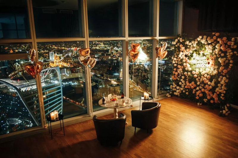 Чтобы устроить идеальный romantic, вам не придется ни о чем заботиться: организацию свидания возьмут на себя менеджеры площадки. Для вас создадут атмосферу той самой романтики, которую вы видели в фильмах — со свечами, воздушными шарами, лепестками роз и столиком на двоих прямо напротив панорамного окна.